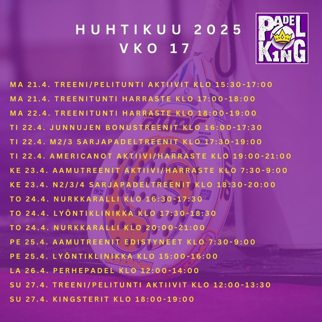 Padel Kingissä harjoituksia järjestetään niin harraste- kuin aktiivipelaajillekin viikoittain. Kannattaa seurata tiiviisti meidän somekanaviamme sekä viikkolukkaria ja ilmoittautua sinulle sopiviin treeneihin. Harjoituksista saat irti parhaan hyödyn, kun käyt treenaamassa säännöllisesti. Voit toki poimia treenivalikoimasta myös erityisesti tietyn teeman mukaisia harjoituksia. Meillä harjoitteluun ei tarvitse sitoutua useaksi kuukaudeksi kerrallaan, vaan voit käydä harjoituksissa juuri niin usein tai harvakseltaan kuin itse haluat. Harjoitusmaksut maksetaan kertaluonteisesti ilmoittautumisen yhteydessä MATCHissa.