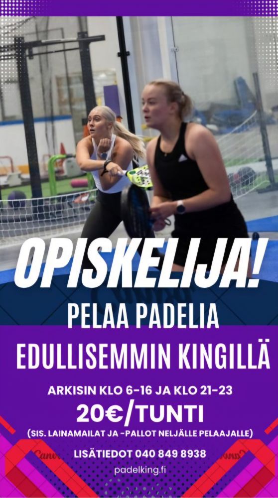 Hei opiskeleva padelisti! Nyt mahdollisuus pelata edullisemmin Padel Kingillä prime timen ulkopuolella. Arkisin klo 6-15 ja 21-23 pelaat hintaan 20€/h. Tule käymään tai lähetä meille kuva voimassa olevasta opiskelijakortista, niin lisäämme sinulle Matchin ajanvarauspalveluun alennukseen oikeuttavat asetukset. Peliä!